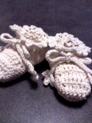 「よだれかけ」。最近は「スタイ」と言うらしいです。 天気も大変悪いので今日は引きこもり妊婦です。 布は切ってあるのでさくさくスタイを縫いました。 こんな感じ。 型紙ははとまめさんのブログ「はとまめ工房」を参考にさせていただきました。 一番手前が今回私のイチオシ「(´・ω・`)ショボーンさんスタイ」です。 完成が嬉しくて妹にメールしたら、 「家用だよね?」 ってえらく冷たい反応…。 え~、「(゚Д゚)ゴルァ」にするか、「(´・ω・`)ショボーン」にするか 旦那さんと家族会議までしたのに…。 ちなみに(´・ω・`)ショボーンさんスタイの模様部分は 「サンラバー」っていうアイロン転写用紙でつけてあります。 手編みのブーティ(20w2d)いつの間にか折り返しを過ぎて6ヶ月に入りました。
