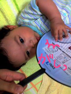蒸し暑いからかなぁ…夏本番はどうするんだろう…。 そんな時のお助けアイテムは団扇! 別に電気代ケチってるわけではないですよ。 (エアコン使うほど暑くはないし) なぜか、今しんちゃんの中では団扇ブームが来ています。 こんな感じ。 「団扇だよ~」 「ちょwそれ持って寝返りは無理かと…!」 ……30分はもつね……。 あと。昨日くらいから盛んに尺取虫みたいな運動をしています。 お腹中心にして回転して、いつの間にか結構移動してたり。 …ハイハイ?ハイハイはまだ早いだろう……(どきどき)。 3種混合1回目昨日になりますが3種混合1回目の予防接種に行ってきました。