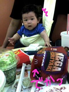 お祝いのお返しを買いに三越に行ってきました。 もちろんしんちゃんも一緒に三越デビュウしてきました。 …三越なんて行ったの何ヶ月ぶりだろう(苦笑)。 お返しはここの烏骨鶏の卵使ったカステラとプリンの詰め合わせにしました。 切り落としのカステラをオマケに貰っちゃった。 (゚Д゚)ウマーでした。←早速食べたのかよ… それよりびっくりだったこと! のしつけてもらったんですが 「名前確認してください」って持ってこられたのしの 文字が濡れてたこと! 手書き(しかも墨で)ですか!!((((;゚Д゚)))) さすが三越…。 デパートって…やっぱり私には敷居が高いよ…。 そして、今日もうちのしんちゃんはあちこちで ウラタロス(仮面ライダー電王に出てくるヤツ)なみに愛想振りまいてました…。 お母ちゃんは君の行く末が心配です…(笑)。 PR 初マックそういえば今気付きましたがもう7月ですね…。 (昨日からか…そうか…) さて今日は初めてマックに行って来ました。 いや、別にマック目的で行ったわけではなかったんですよ、念のため。 今日もカンガルーだっこです。 レジのおねいさんの視線を釘付けでした(いろんな意味で)。 旦那さん「メガテリヤキ」ご注文。 でかいです、しんちゃんもびっくりです。 味の感想は「メガマックよりまし」だったみたいですが。 私ら夫婦が食べているのをしんちゃんはじーーーっと眺めていました。 食べたそうな感じ。 あ~離乳食のこと考えなきゃだめかなぁ…(;・∀・)。 煎餅屋、その後。前回の煎餅屋ネタはコチラ。